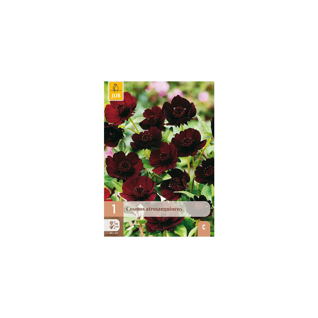 Cosmos atrosanguineus je trvalka s hlízovitými kořeny původem z Mexika. Listy zůstávají poměrně nízké, květy jsou na dlouhých stopkách. Květy jsou velmi tmavě červené, za teplého počasí voní po čokoládě. Výška 5-6 cm._x000D_