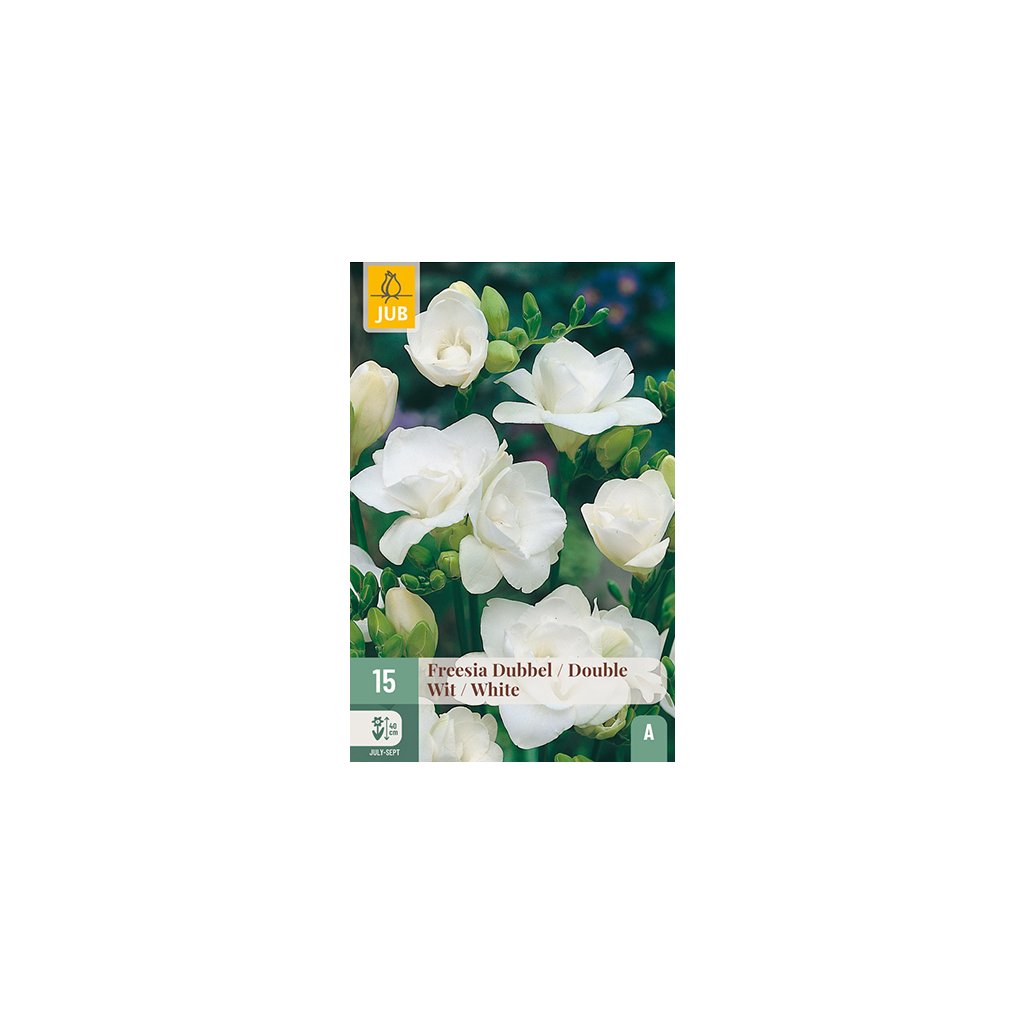 Freesia double white vás překvapí nádherně vonícími dvojitými květy. Tato odrůda frézie je bezproblémovým obyvatelem zahrady, který snadno kvete. Navíc je to vynikající řezaná květina a lze ji krásně kombinovat s dalšími letními cibulovinami._x000D_