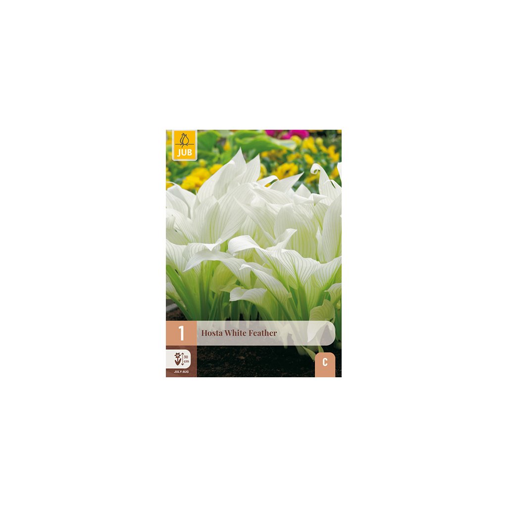 Hosta (Heart Lily) 'White Feather' je oblíbená rostlina. Je to především díky dekorativním listům. Tato rostlina je velmi vhodná pro výsadbu do prostorného květináče. Dobře tvarované, oválné až srdčité listy jsou nápadně bílé se zelenou barvou V létě se podél květních stonků objevují bílé květy, které jsou nad listy a v létě dodávají rostlině další dekorativní hodnotu.