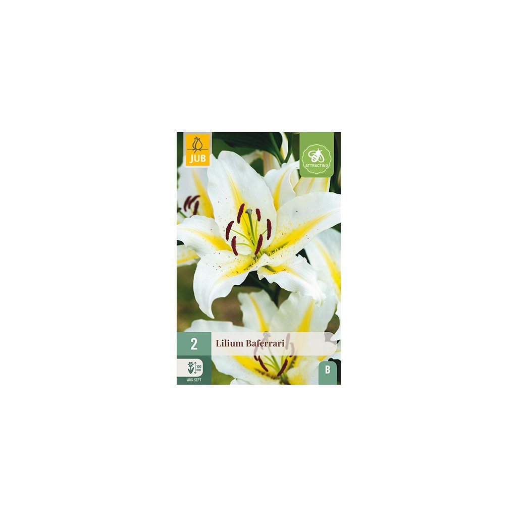 Bílo-žlutá orientální lilie 'Baferrari' je krásná zahradní a řezaná květina. Výška je 11 cm. Lilie se pěkně vyjímají ve skupinách mezi trvalkami a keři. Po odkvětu mohou zůstat v klidu v zemi a rok co rok se vrátí do plného květu. Lilie jsou také velmi vhodné do květináčů nebo květináčů.