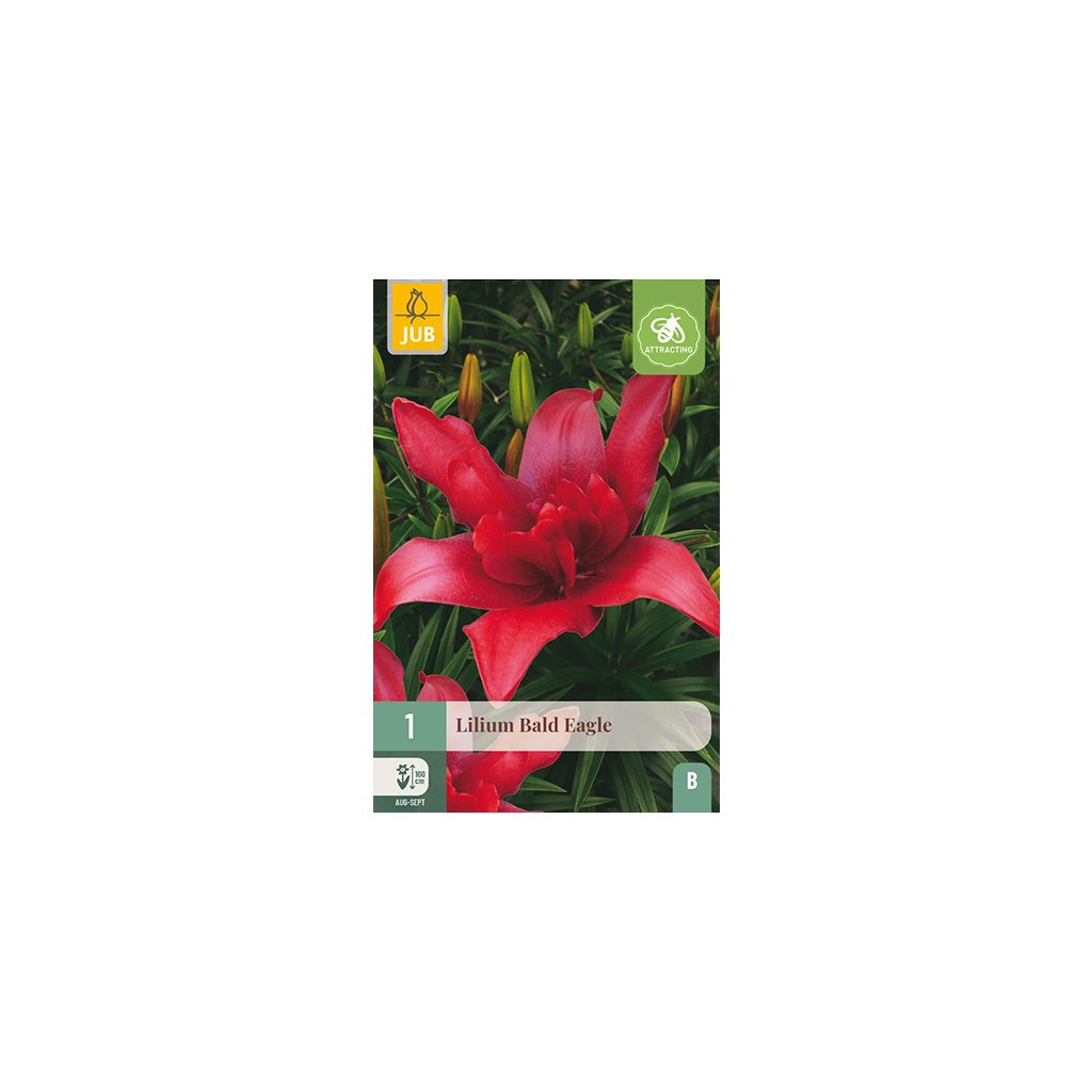 Tmavě červená dvojitá asijská lilie 'Bald Eagle' je krásná zahradní a řezaná květina. Výška je 1 cm. Lilie vypadají skvěle ve skupinách mezi trvalkami a keři. Po odkvětu mohou zůstat klidně v zemi a rok co rok se vrátí do plného květu. Lilie jsou také velmi vhodné do květináčů nebo květináčů.