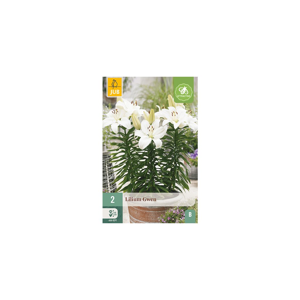 Bílá asijská lilie 'Gwen' je krásná zahradní a řezaná květina se zvláštní barvou. Výška je 45 cm. Lilie se uplatní ve skupinách mezi trvalkami a keři. Po odkvětu mohou zůstat v zemi a budou kvést znovu rok co rok. Tyto lilie jsou velmi vhodné do květináčů nebo květináčů.
