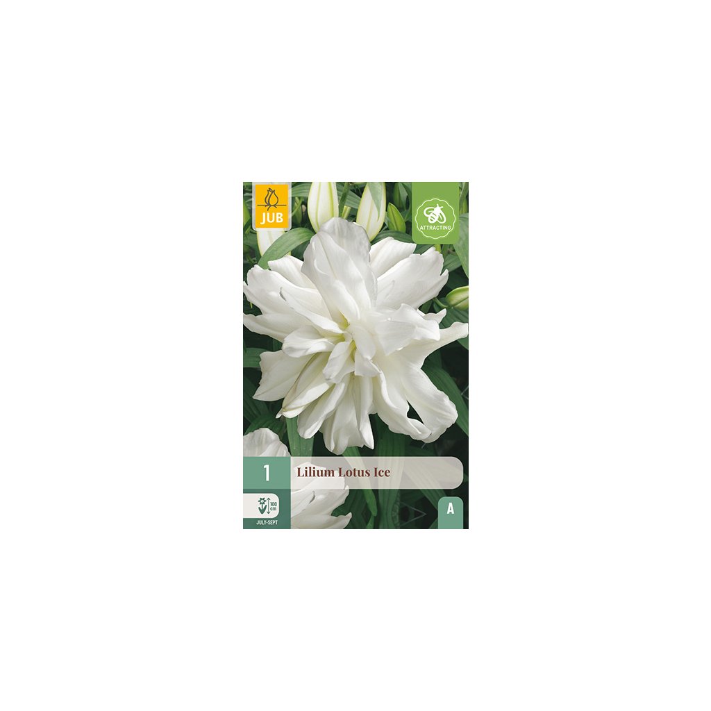 Bílá dvojitá asijská lilie 'Lotus Ice' je krásná zahradní a řezaná květina s úžasnou barvou. Výška je přibližně 1 cm. Lilie vypadají skvěle ve skupinách mezi trvalkami a keři. Po odkvětu mohou zůstat v zemi a budou kvést znovu rok co rok. Lilie jsou také velmi vhodné do květináčů nebo květináčů.