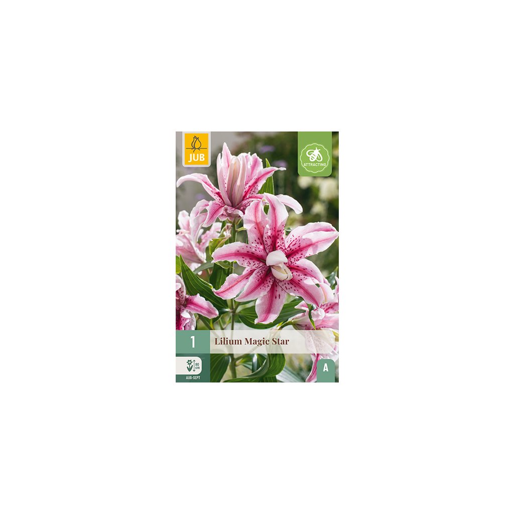 Červenobílá dvojitá asijská lilie 'Magic Star' je krásná zahradní a řezaná květina s úžasnou barvou. Výška je přibližně 8 cm. Lilie vyniknou ve skupinách mezi trvalkami a keři. Po odkvětu mohou zůstat v zemi a budou kvést znovu rok co rok. Lilie jsou také velmi vhodné do květináčů nebo květináčů.