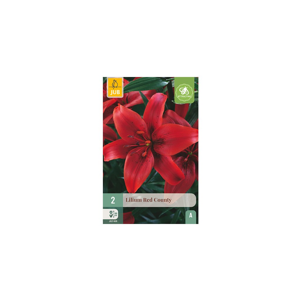 Červená asijská lilie 'Red County' je krásná zahradní a řezaná květina se zvláštní barvou. Její výška je 12 cm. lilie jsou nejkrásnější ve skupinách mezi trvalkami a keři. Po odkvětu je lze zasadit do země. a budou kvést rok co rok. Lilie jsou také velmi vhodné do květináčů nebo květináčů.