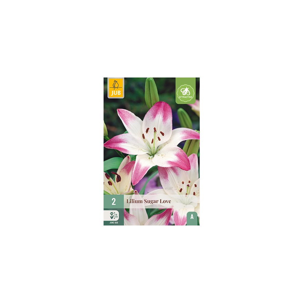 Bílo-růžová asijská lilie 'Sugar Love' je krásná zahradní a řezaná květina se zvláštní barvou. Výška je 7 cm. Lilie vypadají skvěle ve skupinách mezi trvalkami a keři. Po odkvětu mohou zůstat klidně v zemi a rok co rok se vrátí do plného květu. Lilie jsou také velmi vhodné do květináčů nebo květináčů.