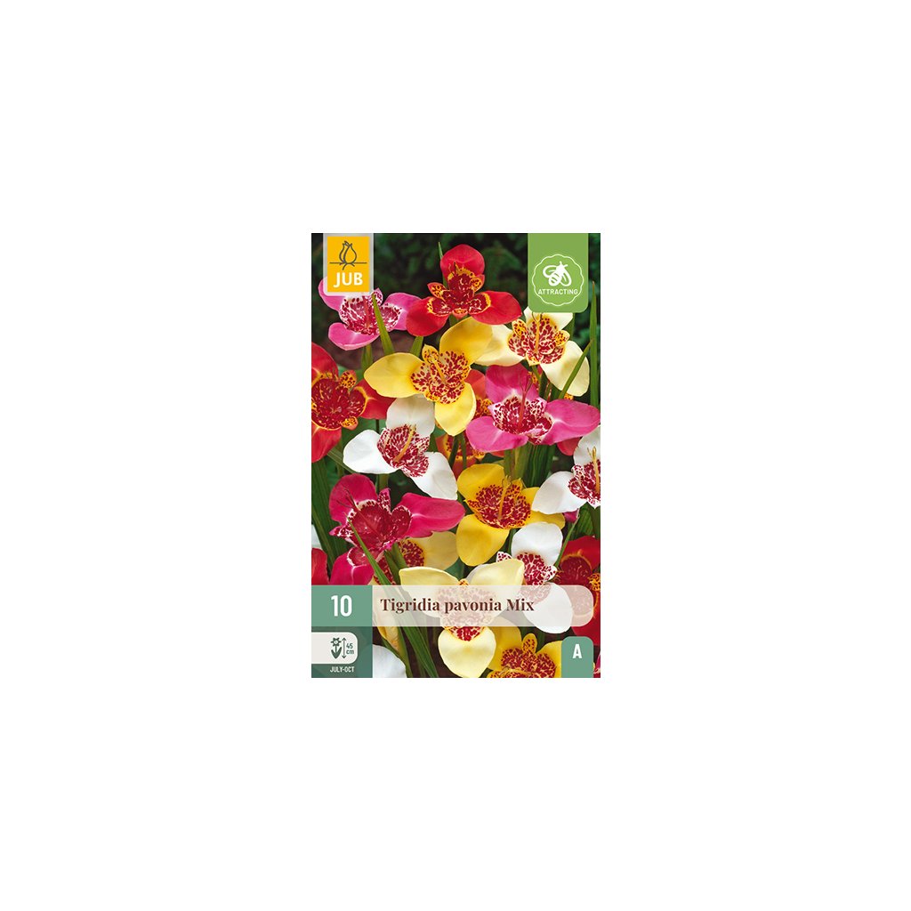 Tigridia pavonia mix (Tygří květ nebo Mexická mušlová květina) má trojúhelníkové květy o velikosti 15 cm a je velmi pestrá. Listy připomínají listy gladiol nebo kosatců. Rostlina má několik květů na větvi, každý květ kvete jen několik dní. Výška 45 cm.