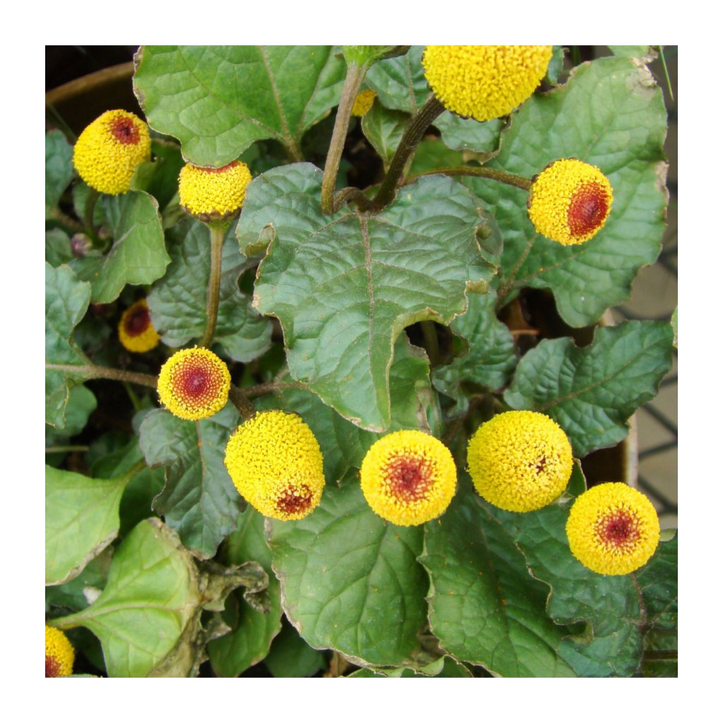 Půvabná letnička se širokými listy a žlutým kulovitým květenstvím. Její listy mají velice pikantní chuť připomínající pepř a představují oblíbenou zeleninu na Madagaskaru a ostrovech v Indickém oceánu. Žvýkání malých kousků květů pomáhá při chronicky suchých očích (celý květ by způsobil předávkování). Plamatka je rovněž známá pro své antiseptické a protiplísňové účinky. Kvete od dubna do srpna.
