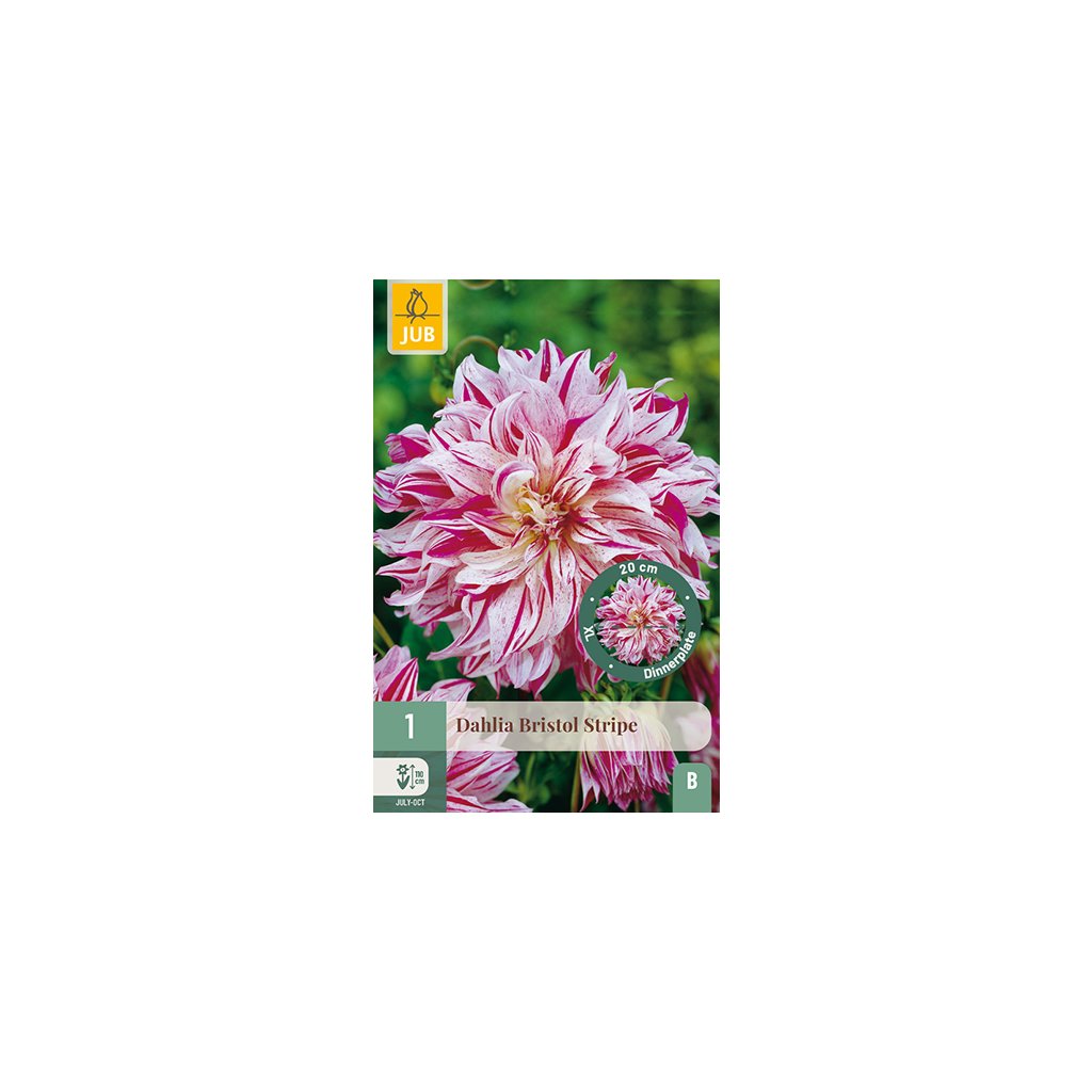 Velkokvětá jiřinka 'Bristol Stripe' je vděčná letnička, která vám bude dělat radost po celé měsíce. Jiřina 'Bristol Stripe' kvete celé léto od července až do prvních mrazů. Jiřinka 'Bristol Stripe' dorůstá výšky asi 1-11 cm. Někdy je nutné květní stvoly podepřít.