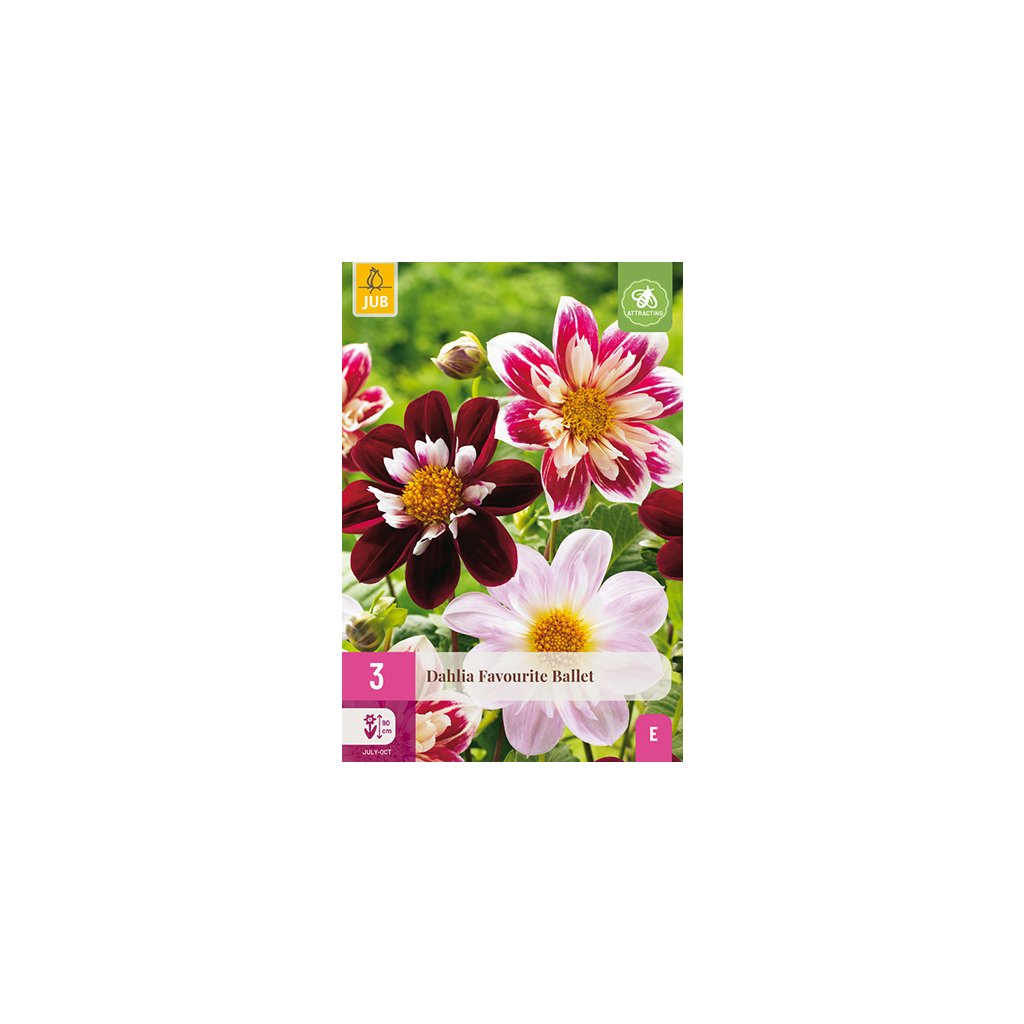 Velkokvětá dekorativní směs jiřin 'Favourite Ballet' je vděčná letní květina, která vám bude dělat radost po celé měsíce. jiřiny kvetou celé léto od července až do prvních mrazů. Tyto jiřiny dorůstají do výšky asi 5 cm. podpěry.