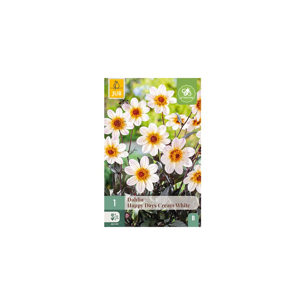 Bílá jiřinka 'Happy Days Cream White' je vděčná letní květina, která vám bude dělat radost po celé měsíce. Díky krásným tmavým listům je tato jiřinka výjimečným doplňkem vašeho záhonu. Jiřina 'Happy Days Cream White' kvete celé léto od července až do prvních mrazů Jiřina 'Happy Days Cream White' dorůstá do výšky asi 3 cm Někdy je nutné květní stvoly podepřít.