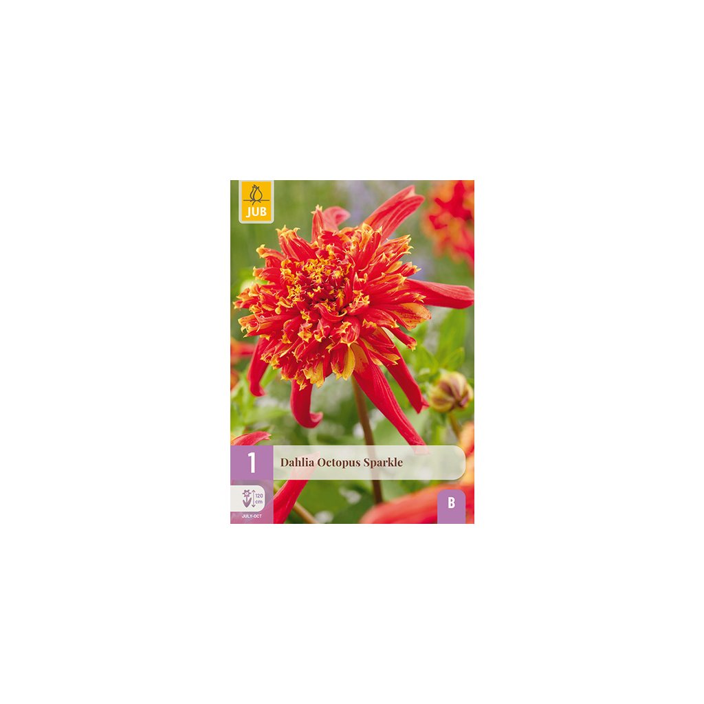 Jiřina typu sasanka 'Octopus Sparkle' je vděčná letnička, která vám bude dělat radost celé měsíce. Jiřina 'Octopus Sparkle' kvete celé léto od července až do prvních nočních mrazíků. Jiřina 'Octopus Sparkle' dorůstá výšky přibližně 12 cm. Někdy je nutné květní stonky podepřít. Na jaře můžete vysadit hlízy jiřinek. Jiřinka 'Octopus Sparkle' je citlivá na mráz, proto si dejte pozor na pozdní (noční) mrazy. Vykopejte velkou výsadbovou jámu, zkypřete půdu a vyplňte ji kvalitní zeminou pro květináče. Hlízy opatrně umístěte do výsadbové jámy a zasypte je 3-5 cm zeminy. Vzdálenost výsadby hlíz je 3-6 cm. Hlízy ihned po výsadbě zalijte. Jiřinky kvetou nejhojněji na plném slunci. Hlízy po odkvětu uložte na bezmrazém místě a budete se z nich těšit po několik let. Jiřinka 'Octopus Sparkle' se dobře kombinuje s trvalkami a dalšími odrůdami jiřinek. Červené a žluté květy jsou na záhonu opravdovým lákadlem pro oči. Jiřinka 'Octopus Sparkle' je také vynikající řezaná květina a má dlouhou životnost ve váze. Nejlepší doba pro řez jiřinek je brzy ráno. Vložte stonky přímo do vlažné vody s výživou pro řezané květiny.