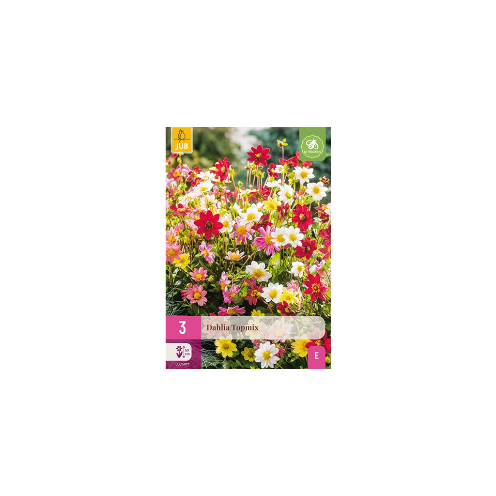 Směs jiřinek 'Topmix' je vděčná letní květina, která vám bude dělat radost po celé měsíce. Jiřiny kvetou celé léto od července až do prvních mrazů. Tyto jiřinky dorůstají výšky kolem 5 cm. Někdy je nutné květní stonky podepřít.