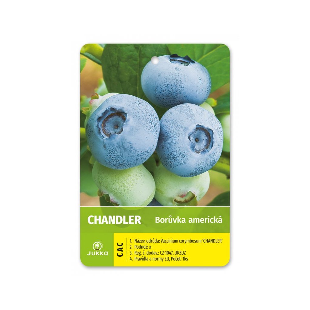 Americká borůvka Chandler je středně až pozdně dozrávající, nenáročná, mrazu i suchu odolná borůvka. Rodí i bez opylovače. Vysadíme-li blízko ní jinou odrůdu, budeme mít vyšší výnosy. Keř americké borůvky Chandler je spíše rozložitý, pravidelně větvený, 120 - 150 cm vysoký. Vysazujeme na slunečné stanoviště do kyselé humózní půdy. Kvete v květnu a červnu. Plody dozrávají od poloviny srpna, jsou světle modré, kulovité, velmi velké (2 - 3 cm). Ze vzrostlé rostliny můžeme sklidit 5 - 6 kg ovoce. Obsahují velké množství vitaminů a minerálních látek, které příznivě působí na lidský organismus. Nejlepší jsou čerstvé, používáme i na džemy a marmelády. Chuťově je tato odrůda považována za jednu z nejlepších.