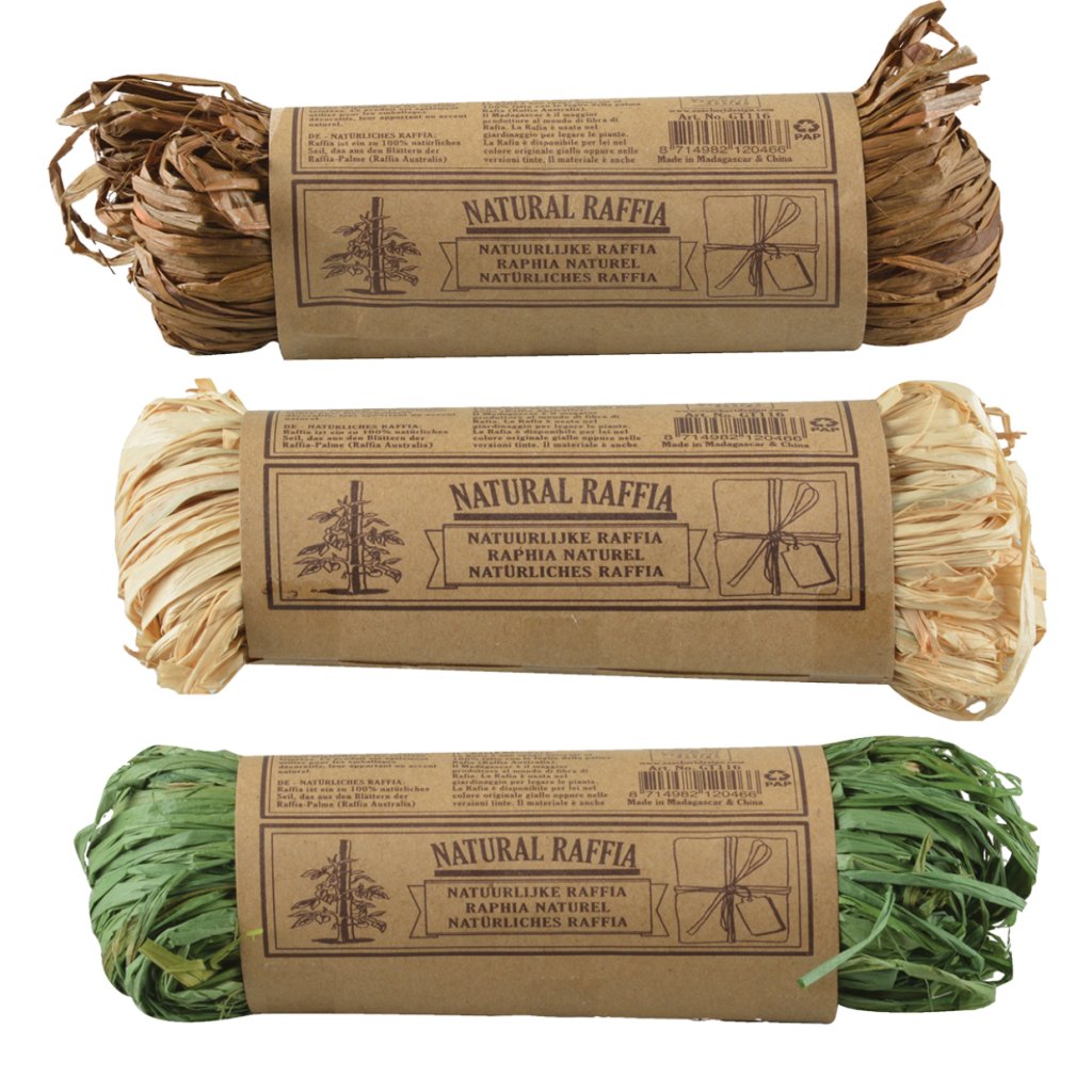 Set 3 ks balení lýka Raffia. Vhodné pro dárková balení, svazování rostlin nebo dekorativní úvazy. Ve 3 různých typech barevného zpracování. V barvách rákosová zelená, mahagonová hnědá a krémová bílá. V papírovém balení opatřeném potiskem s popisem. Rozměr v cm (ŠxHxV): 16,7x6,8x4,7.